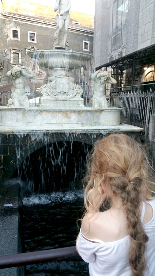 On ne peut l’apercevoir qu’à quelques endroits, comme ici, à la fontaine de l’Amenano, juste à côté du marché au poissons et à la Piazza Del Duomo.