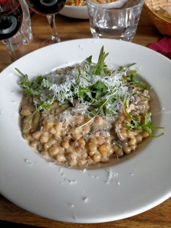 On m'a apporté le menu, et la carte s'est révélée originale. En entrée, une tartine d'houmous et d'avocat, suivie d'un risotto de fragola Sarda, non pas à base de riz, mais de petites pâtes "Piombo".