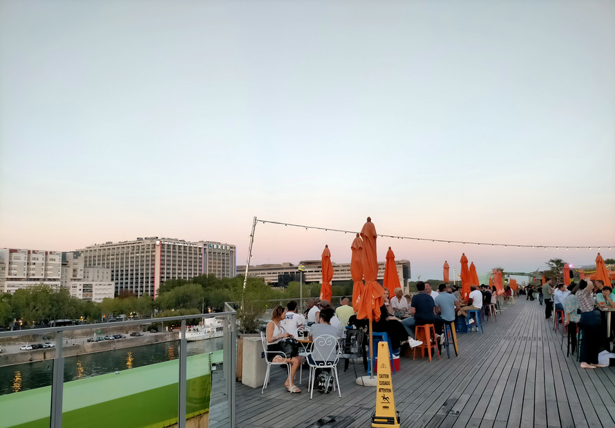 Il y a plusieurs restaurants, à différents étages, mais le plus visible c'est ce roof top, avec de la musique, des transats, des bars et une vue sur la seine.