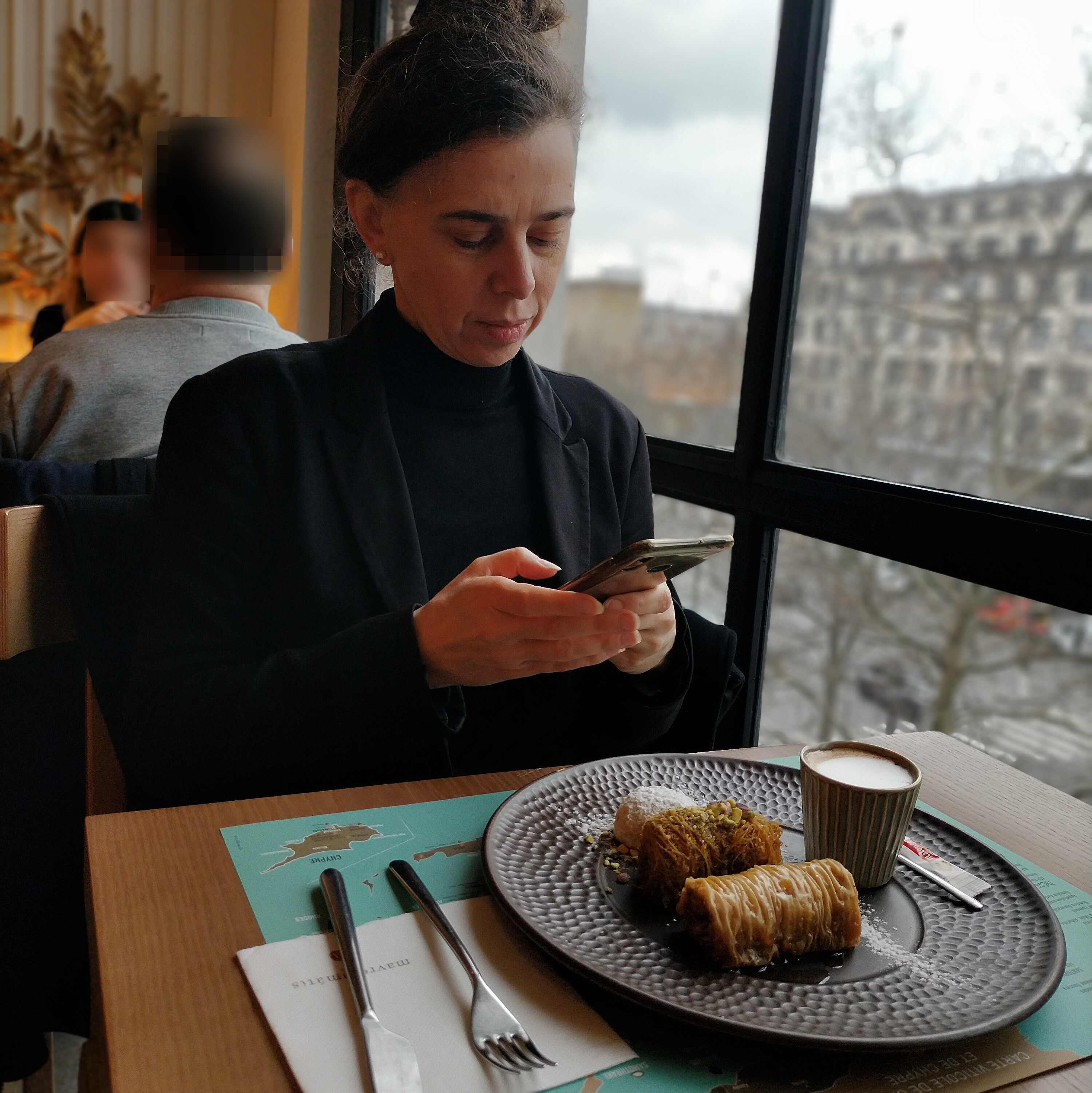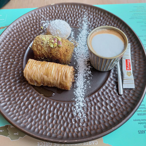 Au-delà des desserts, l’adresse propose aussi un service de restauration sur place, avec des plats typiques comme la moussaka, des mézés chauds et froids, accompagnés d’excellents vins grecs.
