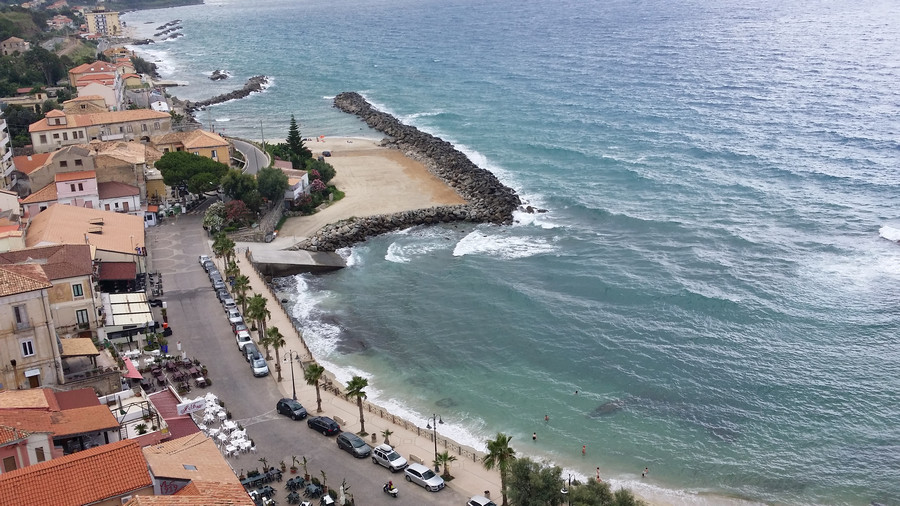 En bas, il y a des criques, avec des eaux transparentes, des coraux, des petits poissons autour. En face, des îles volcaniques dont le Stromboli, le volcan toujours en activité. La ville est "bellissima" avec des petites ruelles qui se rejoignent sur une place centrale.